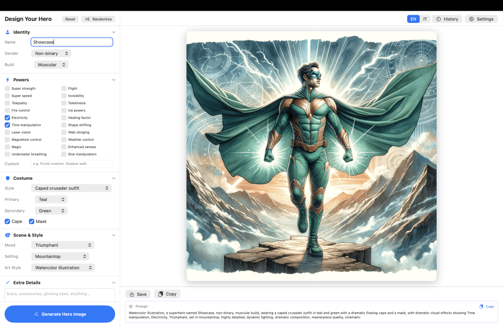 - Language shapes output. I added Italian localization, and not just for the UI — the prompt itself is generated in the selected language. The results differ in subtle but noticeable ways. Language carries cultural weight that models pick up.